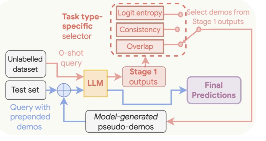 Universal Self Prompting is a two stage process similar to Consistency Based Self Adaptive Prompting (COSP). Here is a breakdown of the two stages.